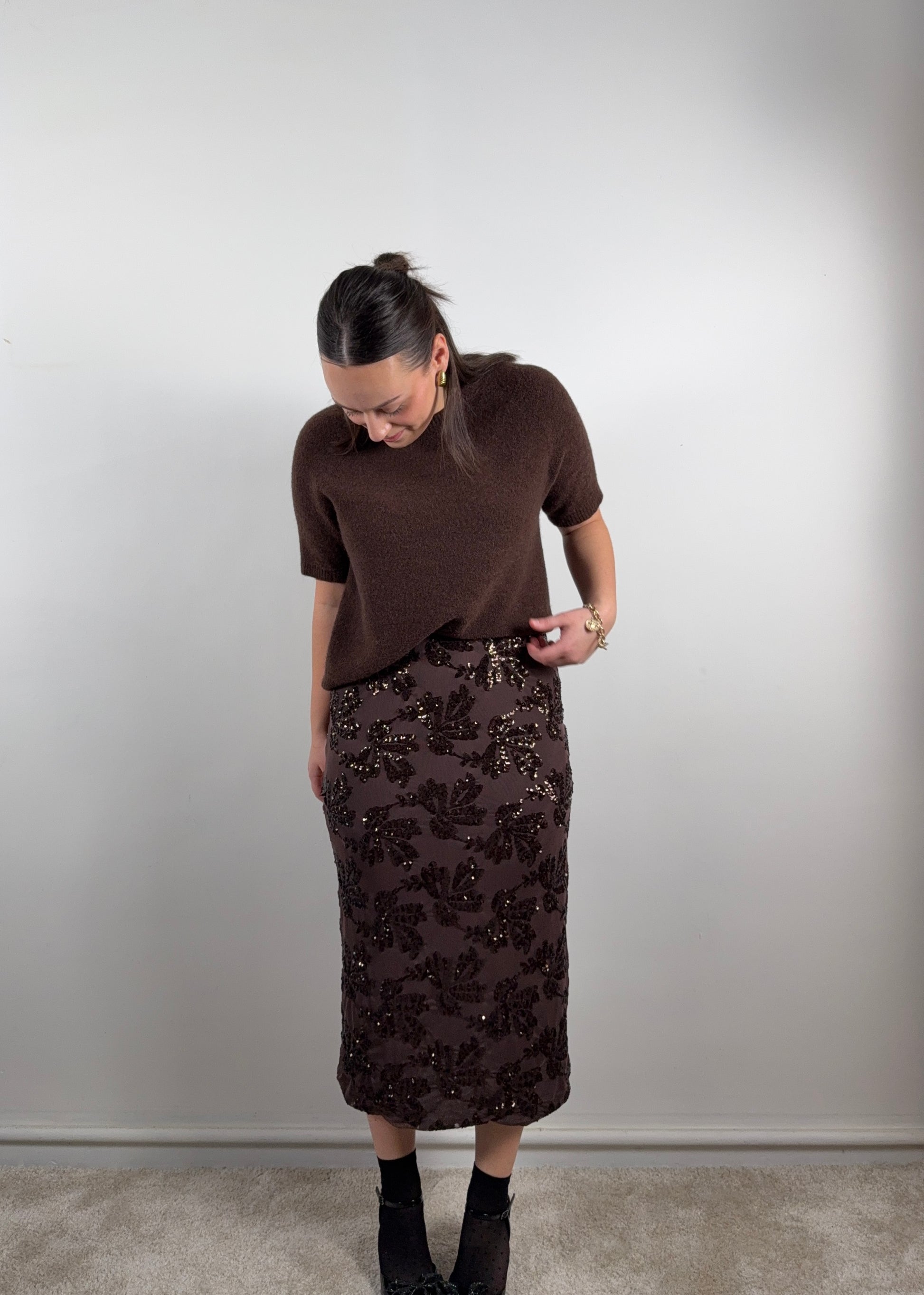 Fleur is een echte blikvanger: een elegante lange rok met subtiele pailletten bloemen die prachtig licht vangen. Super leuk te combineren met onze Tess trui. Fleur heeft een ideale lengte voor vrouwen onder de 165 cm. Ben je groter? Hou er dan rekening mee dat de rok iets korter zal vallen.